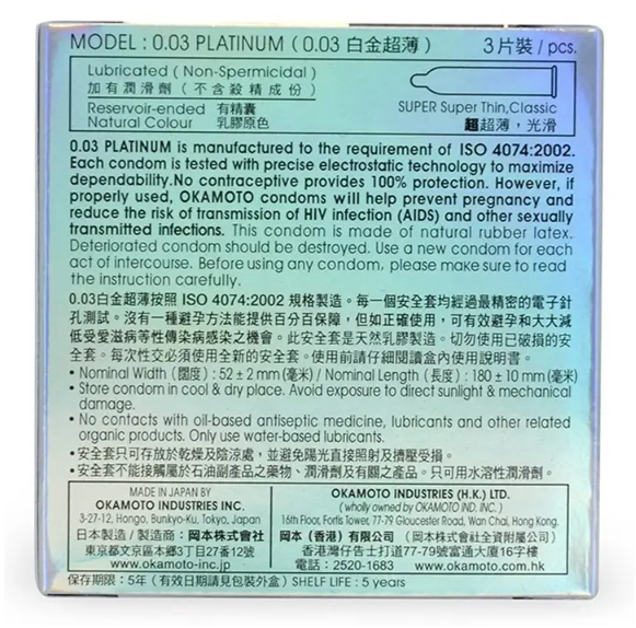 3. Trước khi dùng, hãy đọc kỹ các thông tin và hướng dẫn sử dụng in rõ trên bao bì của bao cao su Okamoto 0.03 Platinum để tránh nhầm lẫn hoặc sử dụng sai cách.
